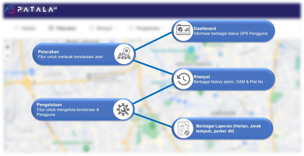Perusahaan & perorangan dapat memanfaatkan berbagai fitur pada platform PATALA.id dalam memonitor aset bergerak mereka. Mulai dari dasboard status aset, pelacakan (tracking), pengelolaan aset, hostorical data & berbagai laporan.